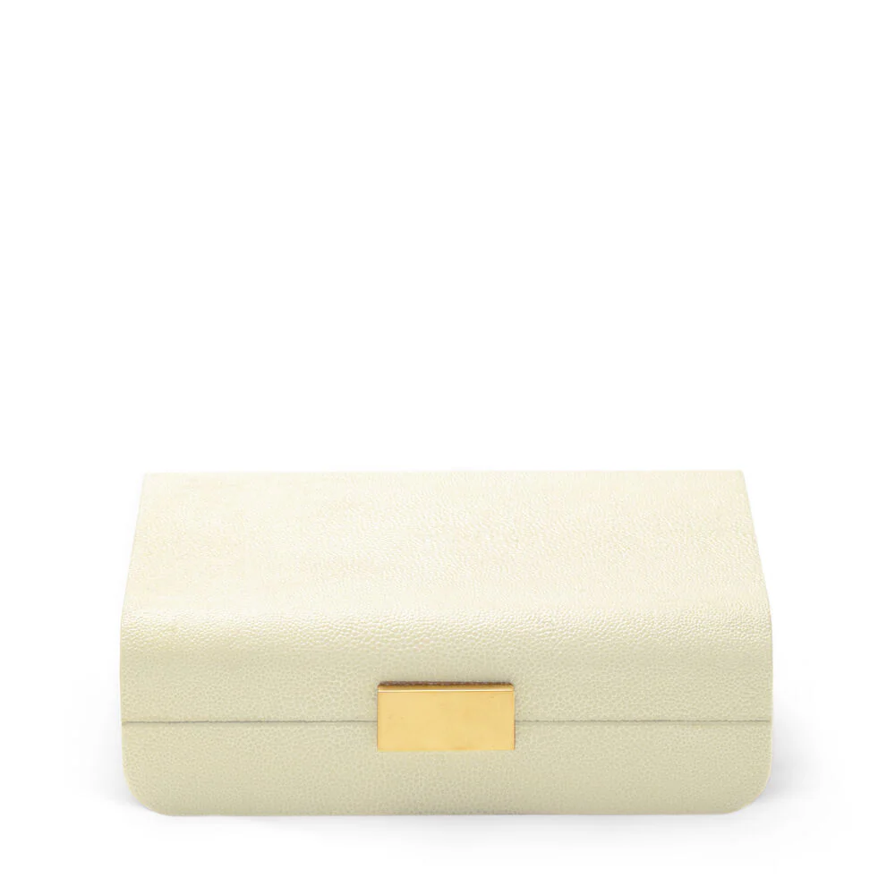 This decorative box is finished with a textured, embossed shagreen. Its curved lines have a sculptural appeal, while brass detailing adds a stylish touch. Use it for jewelry on a vanity or to organize personal objects on a desk or table.