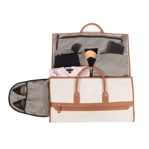 The Capri 2-in-1 garment bag is designed with the business traveler in mind, stylish enough for overnights that include some leisure time. Made from a lightweight canvas and accented with vegan leather. Features a adjustable shoulder strap; outer zipper compartment for quick access and extra interior pockets for quick access of your phone, wallet and keys.