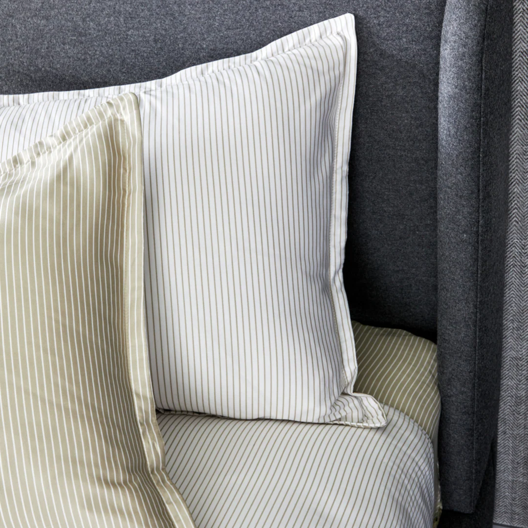 The perfect calming neutral to complete any bedroom features a thin stripe design. Its versatile pattern makes it easy to pair with fun patterns or a classic solid.