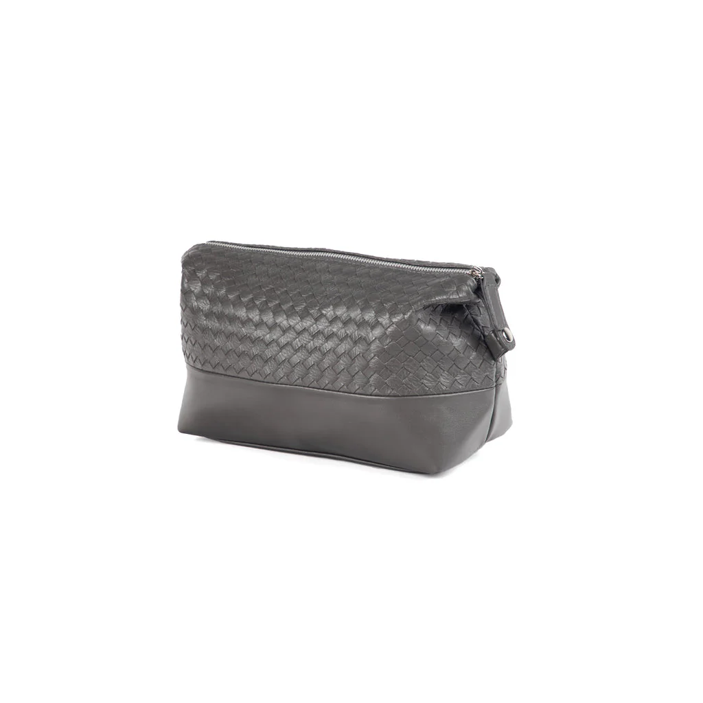 This woven style toiletry bag is made from durable vegan leather. The interior consists of black striped lining and a pocket perfect for your smaller toiletries. The stylish and modern look will make sure to turn heads.Â