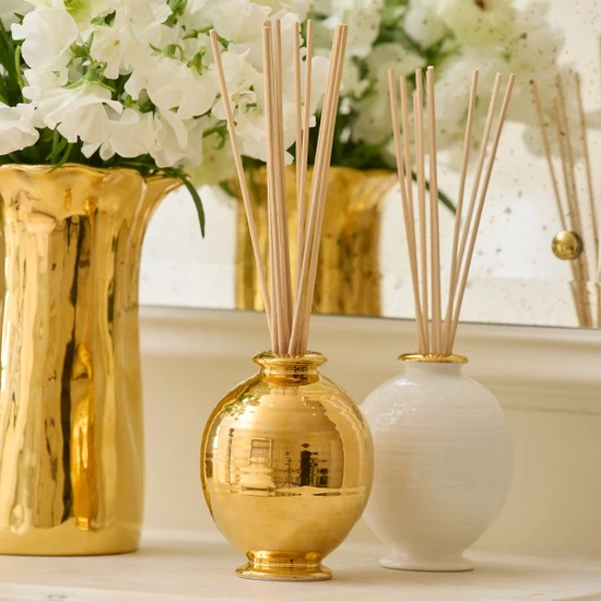 The Siena diffuser set features a spherical ceramic vessel enhanced with the potters handmade ribbing, providing an artisanal look. The reed sticks that sit in the pot disperse AERIN’s bestselling L'Ansecoy Orange Blossom scent, a sun-kissed blend of Orange Blossom and sweet Cedar enhanced by the citrus of Petitgrain. A glass funnel allows for easy refilling. This set is beautifully presented in an elegant AERIN-branded cream box, ready for gifting.